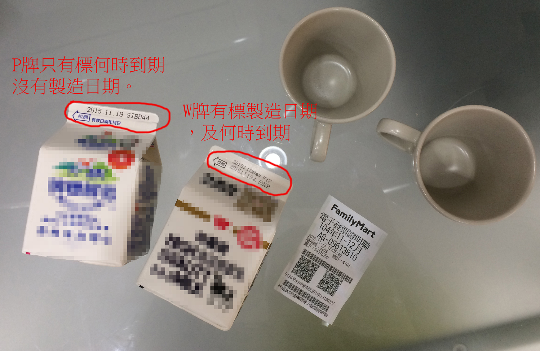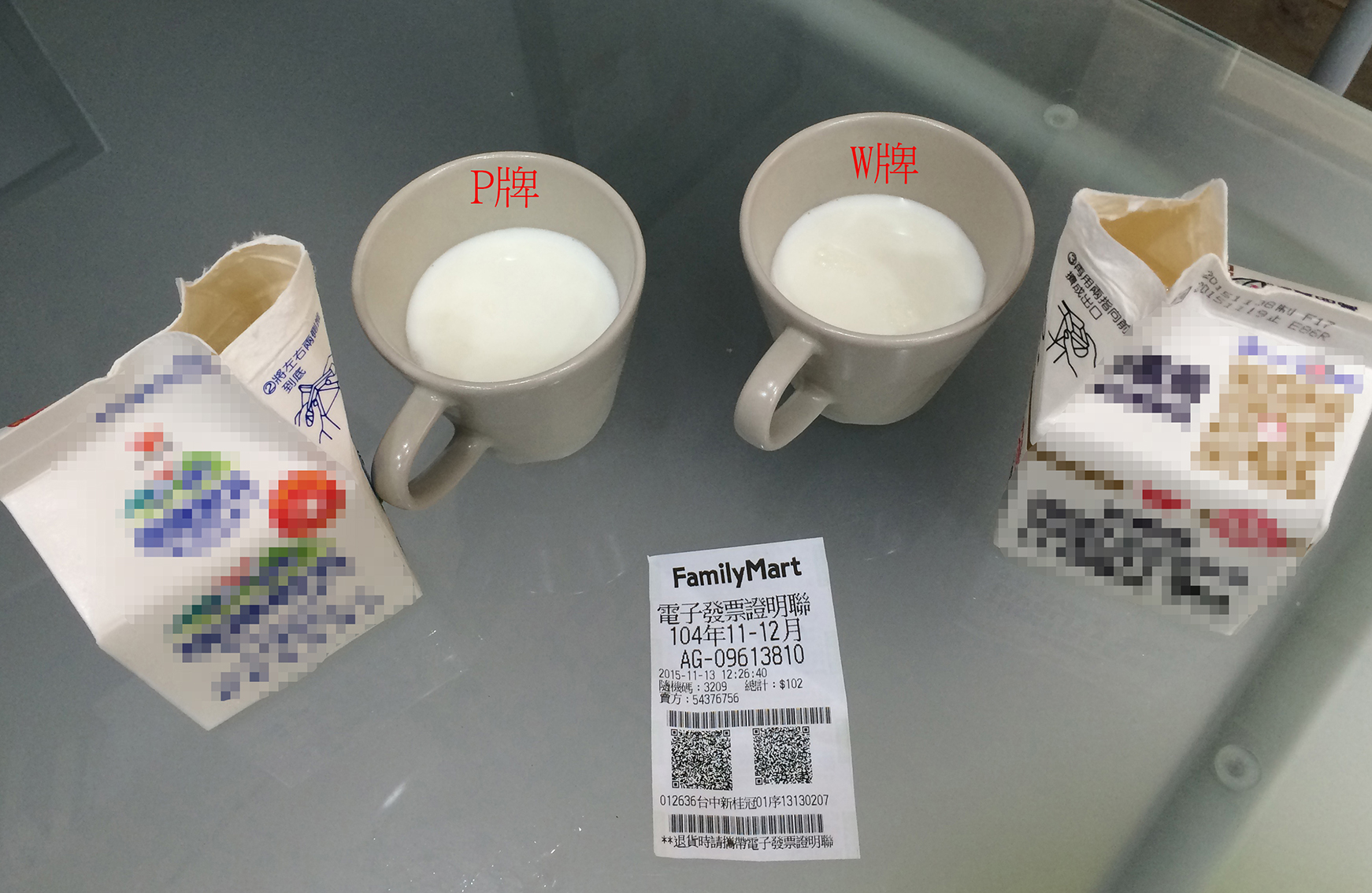測試對象:P牌及W牌鮮乳各一瓶
