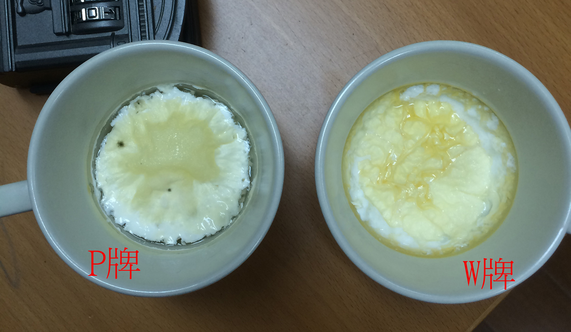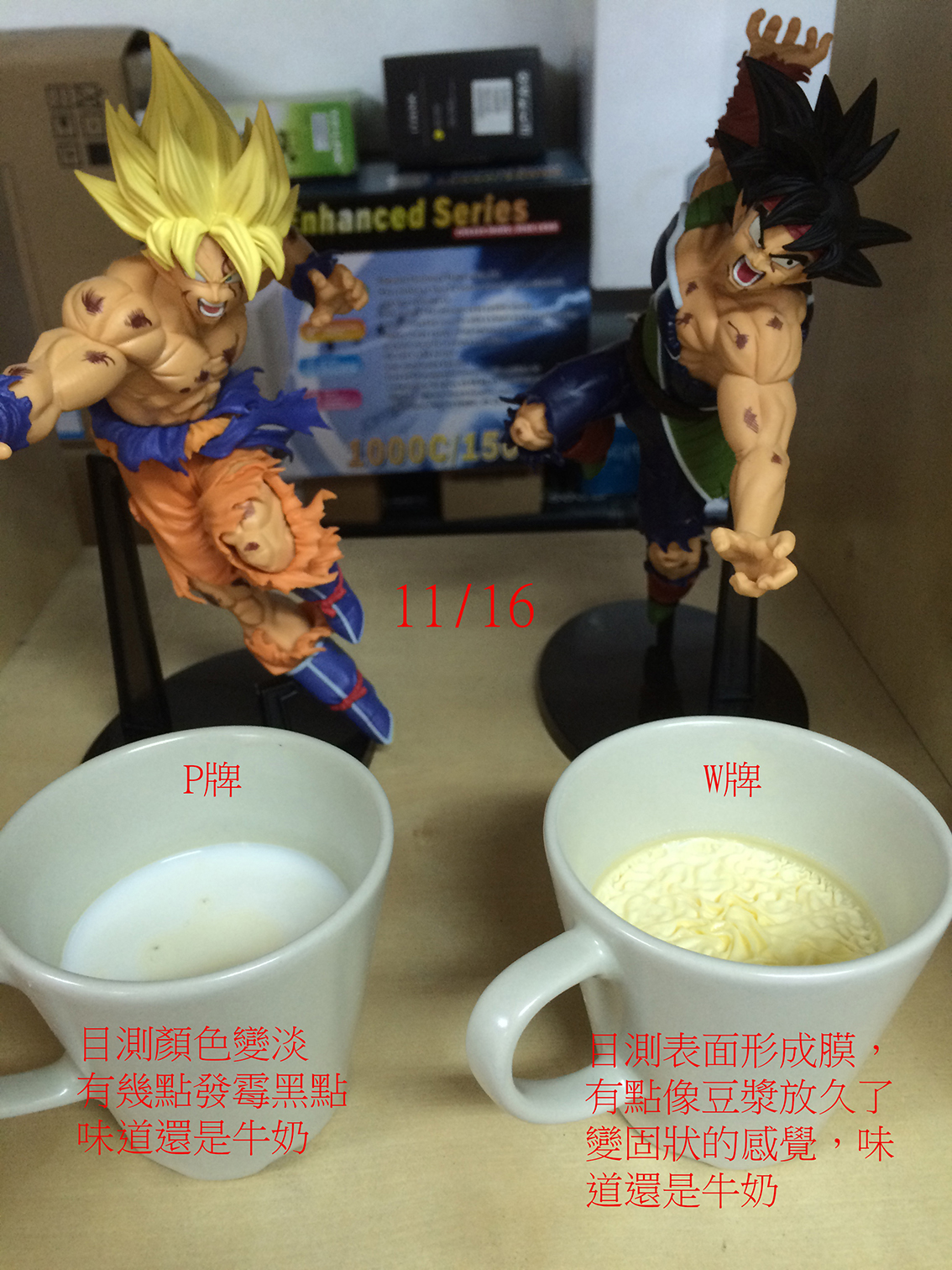 11/16 兩杯鮮乳有了變化,P牌鮮乳顏色變淡,W牌表面有了一層膜,這時候兩個品牌聞起來都還是有鮮乳味,沒有臭味。