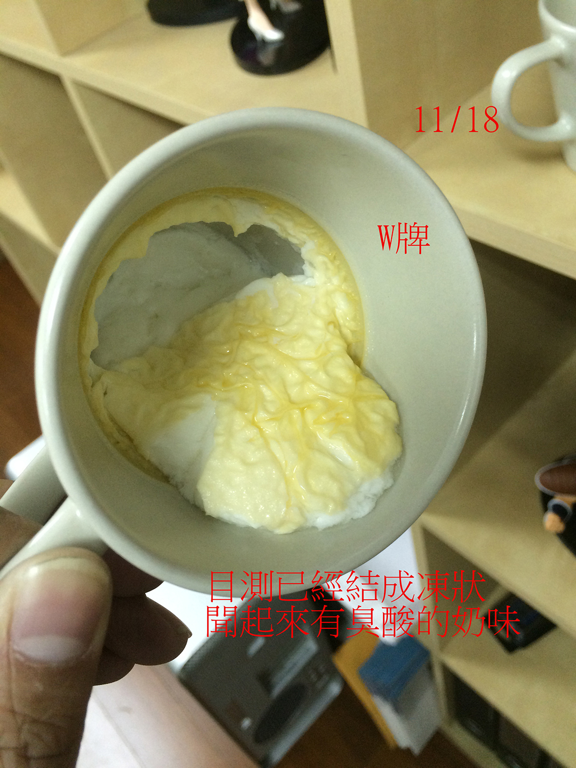 W牌目測已經結成凍狀,有點像優酪乳,味道聞起來也是臭酸的鮮乳。
