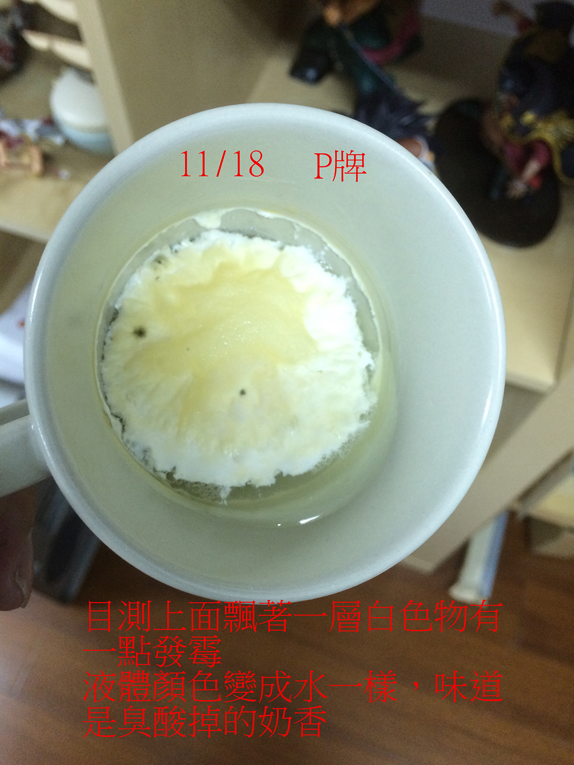 P牌上面飄著一層白色物有發霉點點,然後液體看來不是鮮乳的白色,而是像水一樣的透明,味道聞起來是臭酸的鮮乳。