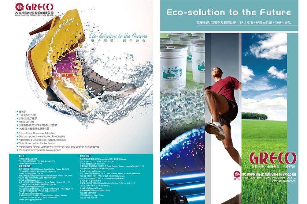 GRECO為台灣第一家鞋用接著劑製造廠,主要提供四大產品線分別為,接著劑及水性系列膠黏劑、塑化產品、乾膜及特殊化學品。是一家在品質、技術、環保、工安及顧客滿意表現卓越且善盡回饋責任之企業。點我觀看線上目錄